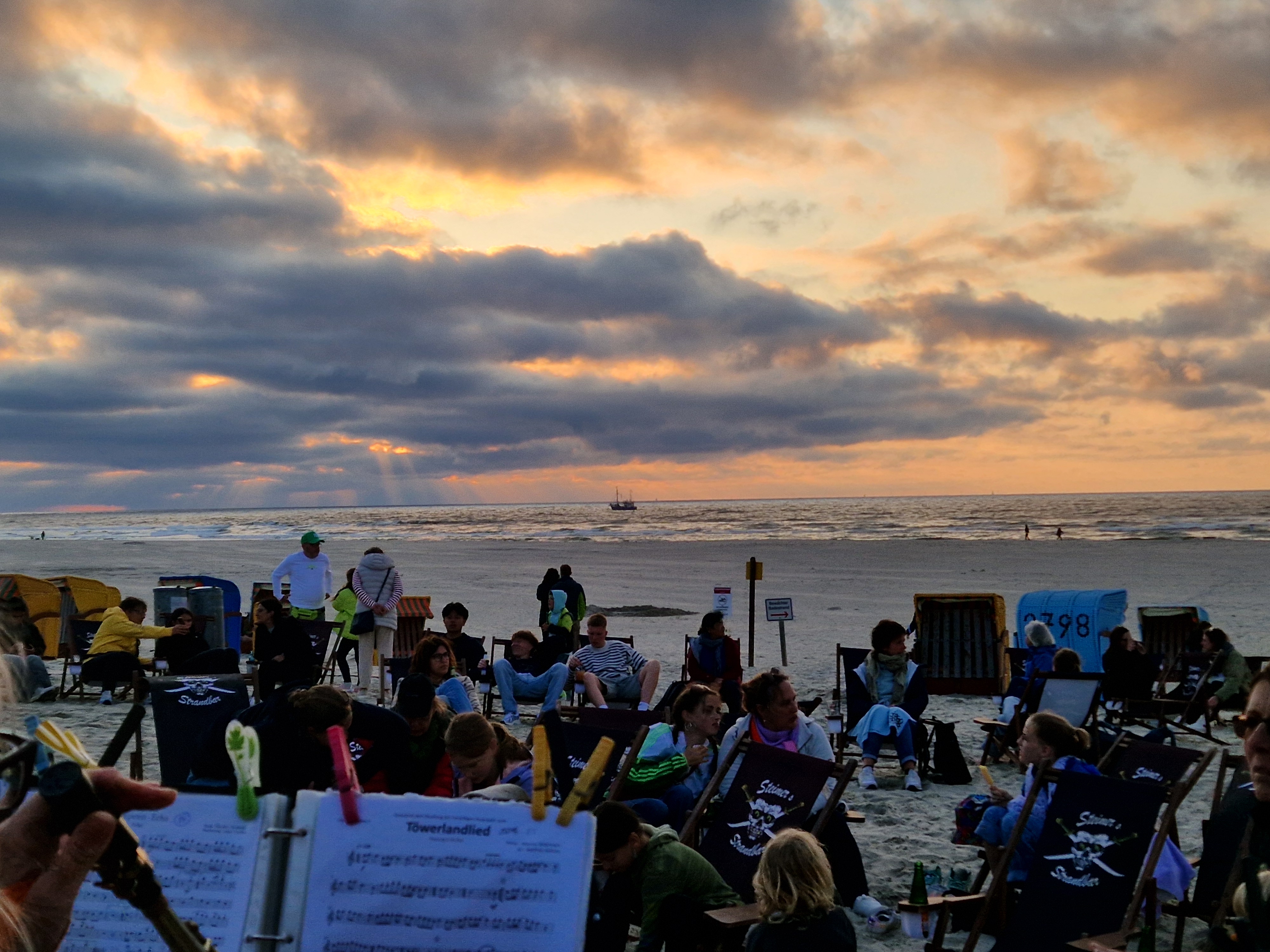 Unter der musikalischen Leitung von Michael Bockelmann spielten, bei wunderschönem Wetter, die Musikerinnen und Musiker der Juister Wehr eine knappe Stunde für die anwesenden Zuschauer. Auch viele Norderneyer konnten diesem Highlight beiwohnen, denn der Seglerverein Norderney führte an diesem Wochenende sein Absegeln durch, welches sie nach Juist zu einem gemeinsamen Grillen an „Scholles Bierbude“ führte.